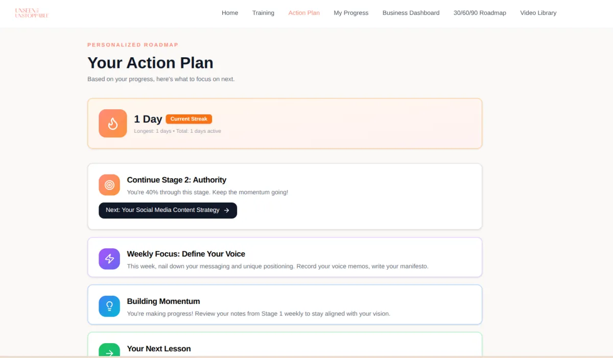 You always know the priority. No guessing what to work on next. Every week has a defined objective and execution path.